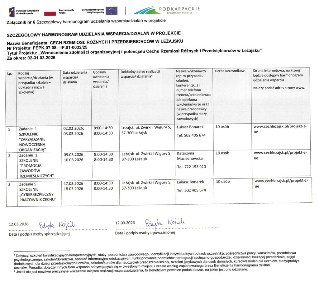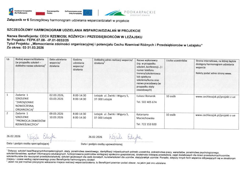 Realizacja wsparcia w ramach projektu: „Wzmocnienie zdolności organizacyjnej i potencjału Cechu Rzemiosł Różnych i Przedsiębiorców w Leżajsku ”. nr FEPK.07.08–IP.01-0032/25 Za okres: 02-31.03.2026