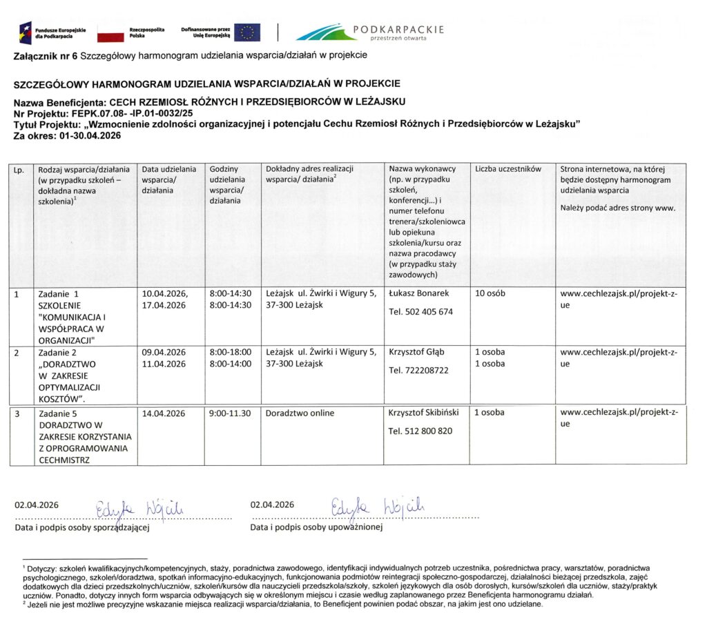 Realizacja wsparcia w ramach projektu: „Wzmocnienie zdolności organizacyjnej i potencjału Cechu Rzemiosł Różnych i Przedsiębiorców w Leżajsku ”. nr FEPK.07.08–IP.01-0032/25 Za okres: 01-30.04.2026