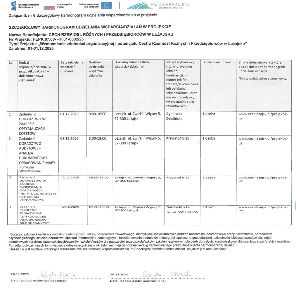 SZCZEGÓŁOWY HARMONOGRAM UDZIELANIA WSPARCIA W PROJEKCIE