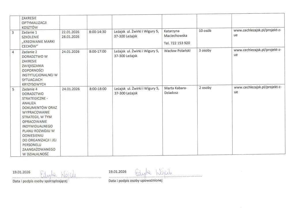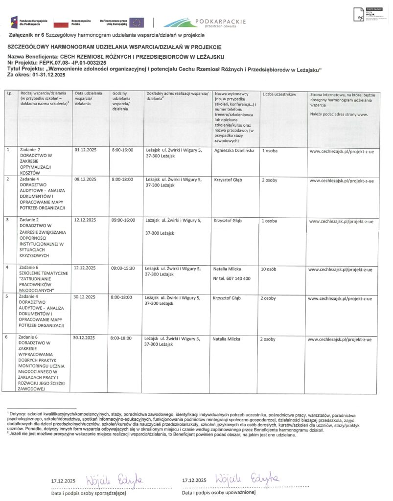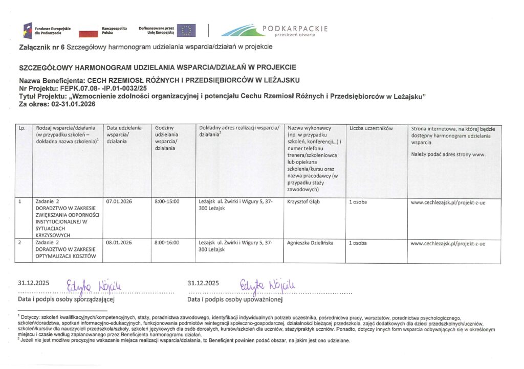 Realizacja wsparcia w ramach projektu: „Wzmocnienie zdolności organizacyjnej i potencjału Cechu Rzemiosł Różnych i Przedsiębiorców w Leżajsku ”. nr FEPK.07.08-IP.01-0032/25 Za okres: 02-31.01.2026